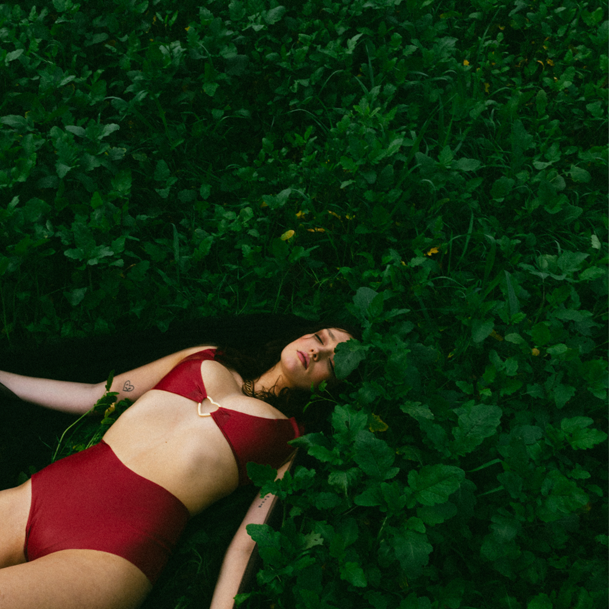 This bra top is all vixen. Deep red slick latex, pull over style with gold heart at center front. Pairs with our Latex shorties