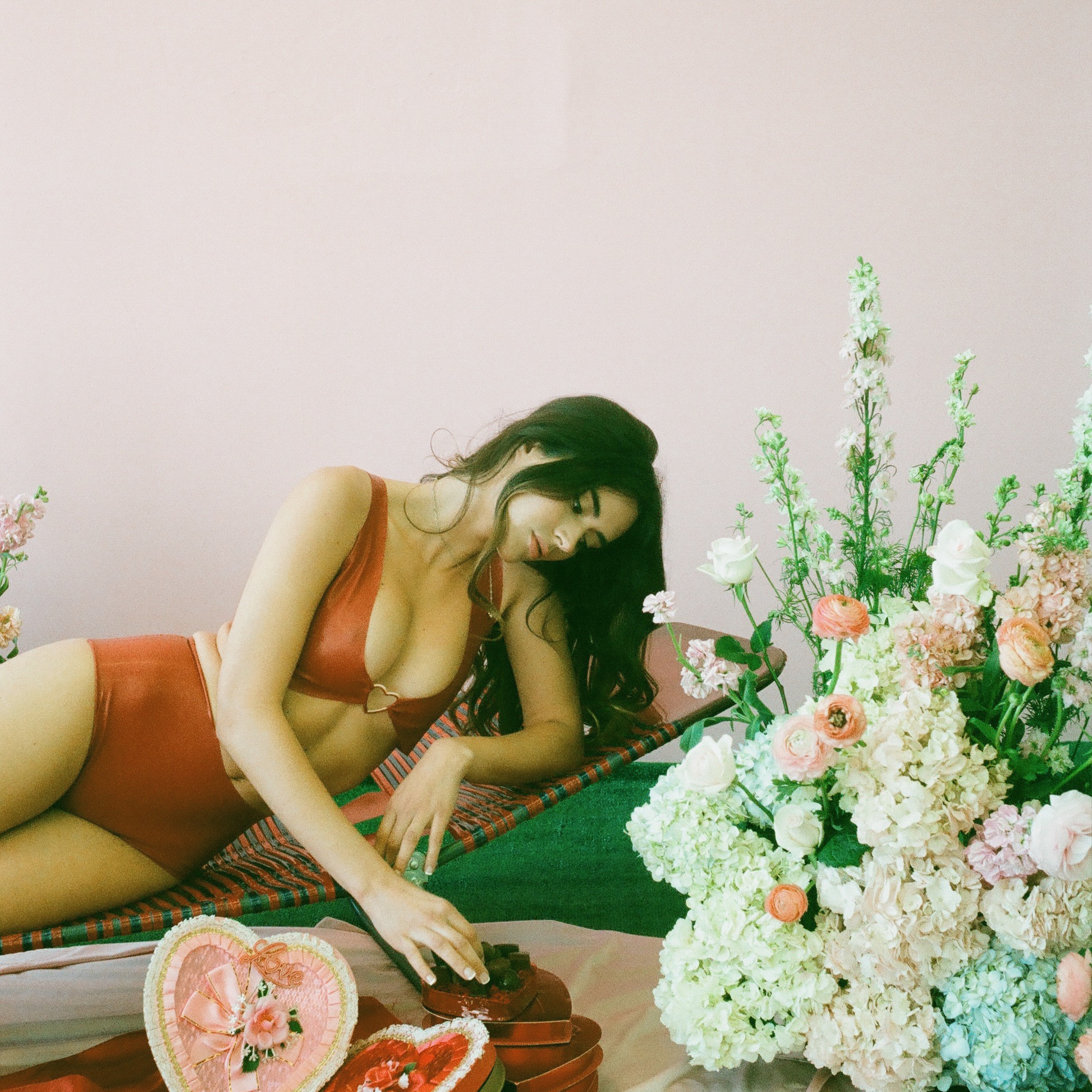 This bra top is all vixen. Deep red slick latex, pull over style with gold heart at center front. Pairs with our Latex shorties