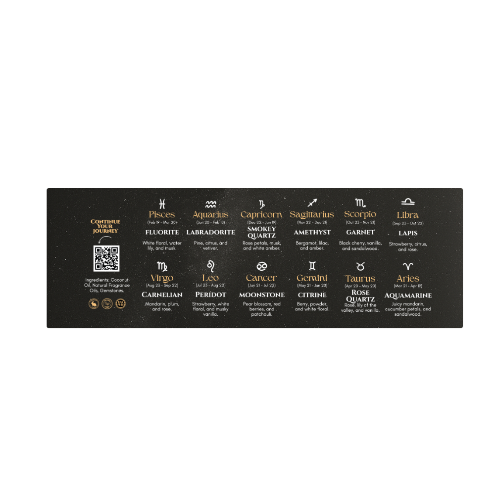Explore the power of scent aligned with the stars. This 12-piece discovery set features gemstone-infused perfume oils, each crafted to enhance the energy and personality of its zodiac sign. Housed in a sleek black box, it’s perfect for discovering your match—or gifting a little cosmic magic.